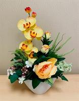 Pot en pierre lesté pour éviter la prise au vent, composé de fleurs artificielles dans les tons jaune (roses, lys, orchidées...) Hauteur 34 cm Largeur 12 cm