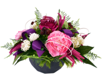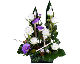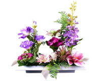 | Composition ultra-plate parme Composition ultra-plate avec roses, magnolias, gerberas, delphiniums, succulents et ruban de taffetas dans support lesté - Tonalité parme - Dimensions 39 x 17 et H 42 cm -