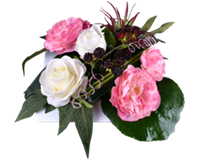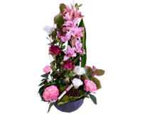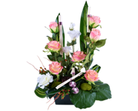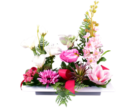 | Composition ultra-plate rose Composition ultra-plate avec roses, magnolias, gerberas, delphiniums, succulents et ruban de taffetas dans support lesté - Tonalité rose - Dimensions 39 x 17 et H 42 cm -