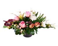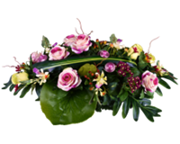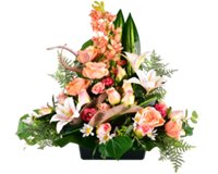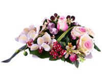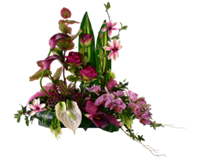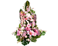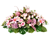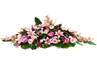 | Dessus de cercueil rose Dessus de cercueil avec roses, lys, cymbidiums et hortensias - Dimensions : 152 x 52 cm - Tonalité Rose - Possibilité de rajouter option ruban (texte à préciser lors de la commande) -