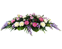 | Dessus de cercueil pastel Dessus de cercueil avec dahlias, roses, orchidées, hortensias, glycines & gerberas sur support lesté - Dimensions : 154 x 64 cm - Tomalités de lavande, blanc & rose - Possibilité de rajouter option ruban (texte à préciser lors de la commande) -