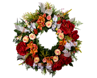 | Couronne saumon & rouge Couronne avec roses, orchidées, pivoines, fleurs de cerisier, astilbes et fleurs sauvages sur support lesté - Diamètre env. 70 cm - Tonalités de saumon et rouge - Possibilité de rajouter option ruban (texte à préciser lors de la commande) -