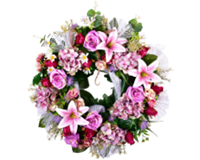 | Couronne pastel Couronne avec roses et boutons, lys, hortensias, chardons, gardénias sur support lesté - Diamètre env. 60 cm - Tonalité lavande et rose - Possibilité de rajouter option ruban (texte à préciser lors de la commande) -