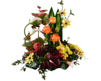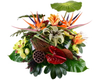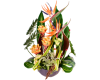 | Coussin orange Coussin avec héliconias, gingers, orchidées, anthuriums et tillandsias dans support lesté - Tonalité orange - Dimensions 63 x 57 cm - Possibilité de rajouter option ruban (texte à préciser lors de la commande) -