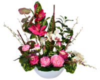 | Panier rose Panier avec roses, glycines, callas, gerberas, succulents dans support lesté - Tonalités de rose et fuchsia - Dimensions 49 x 27 et H 48 cm -