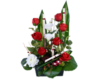 | Raquette rouge & blanche Raquette avec roses, orchidées, lysianthus, pivoine et ginkgo avec fil aluminium sur support lesté - Dimensions : 81 x 60 cm - Tonalités : rouge et blanc - Possibilité de rajouter option ruban (texte à préciser lors de la commande) -