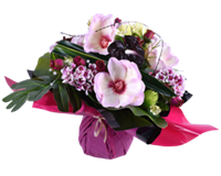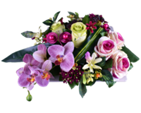 | Ultra plate lavande Ultra plate avec roses et boutons, orchidées, mûres et dracena dans contenant lesté - Coloris lavande - Dimensions 38 x 25 cm et H 16 cm -