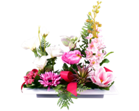 | Jardinière rose Jardinière avec roses et boutons, lys, cymbidiums et gardénia dans support lesté - Couleur rose - Dimensions 60 x 29 cm et H 56 cm -