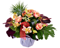 | Jardinière orange Jardinière avec roses et boutons, lys, cymbidiums et gardénia dans support lesté - Couleur orange - Dimensions 60 x 29 cm et H 56 cm -