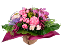 | Bouquet bulle rose Bouquet bulle de pivoines, roses, orchidées, astilbes avec ruban de jute dans support lesté - Tonalité de rose soutenu - Diamètre env. 45 cm -