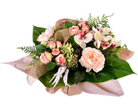| Coussin saumon Coussin avec dahlias, pivoines, roses, orchidées et anthurium dans support lesté - Tonalité saumon - Dimensions 69 x 65 cm - Possibilité de rajouter option ruban (texte à préciser lors de la commande) -