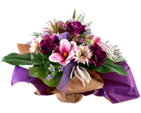 | Gerbe lavande Gerbe avec gerberas, roses, delphiniums, tillandsias, lavande et ruban de jute sur support lesté - Tonalité lavande - Dimensions 9à x 73 cm - Possibilité de rajouter option ruban (texte à préciser lors de la commande) -