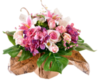 | Bouquet bulle rose Bouquet bulle avec roses et boutons, lys, hortensias, gardénias et jute dans support lesté - Tonalité rose - Diamètre env. 42 cm -