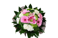 Photo for illustration purposes only | Bouquet Tendresse Bouquet rond avec réserve d'eau, dans les tons rose, blanc et vert.