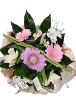 Photo for illustration purposes only | Gerbe pastel Essence Elégante gerbe piquée fleurs de saison de tonalité rose pastel. Longueur 70 cm env.