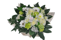 Photo for illustration purposes only | Gerbe Blancé Gerbe piquée de fleurs de saison dans les tons blanc et vert. Longueur 70 cm env.