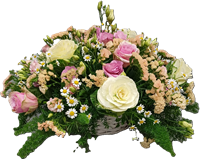 Photo for illustration purposes only | Devant de tombe Sillage Devant de tombe dans les tons de rose et blanc avec rose, gerberas, lys et autres fleurs de saison. Longueur environ 80 cm.