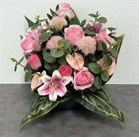 | Composition de fleurs tergal Composition de fleurs tergal dans un pot lesté avec des roses et anthuriums.