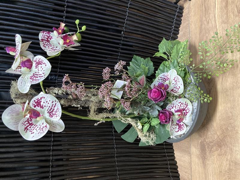Jolie coupe taupe poudrée composée de magnifiques orchidées et de roses grenat sur hauteur de 50 cm