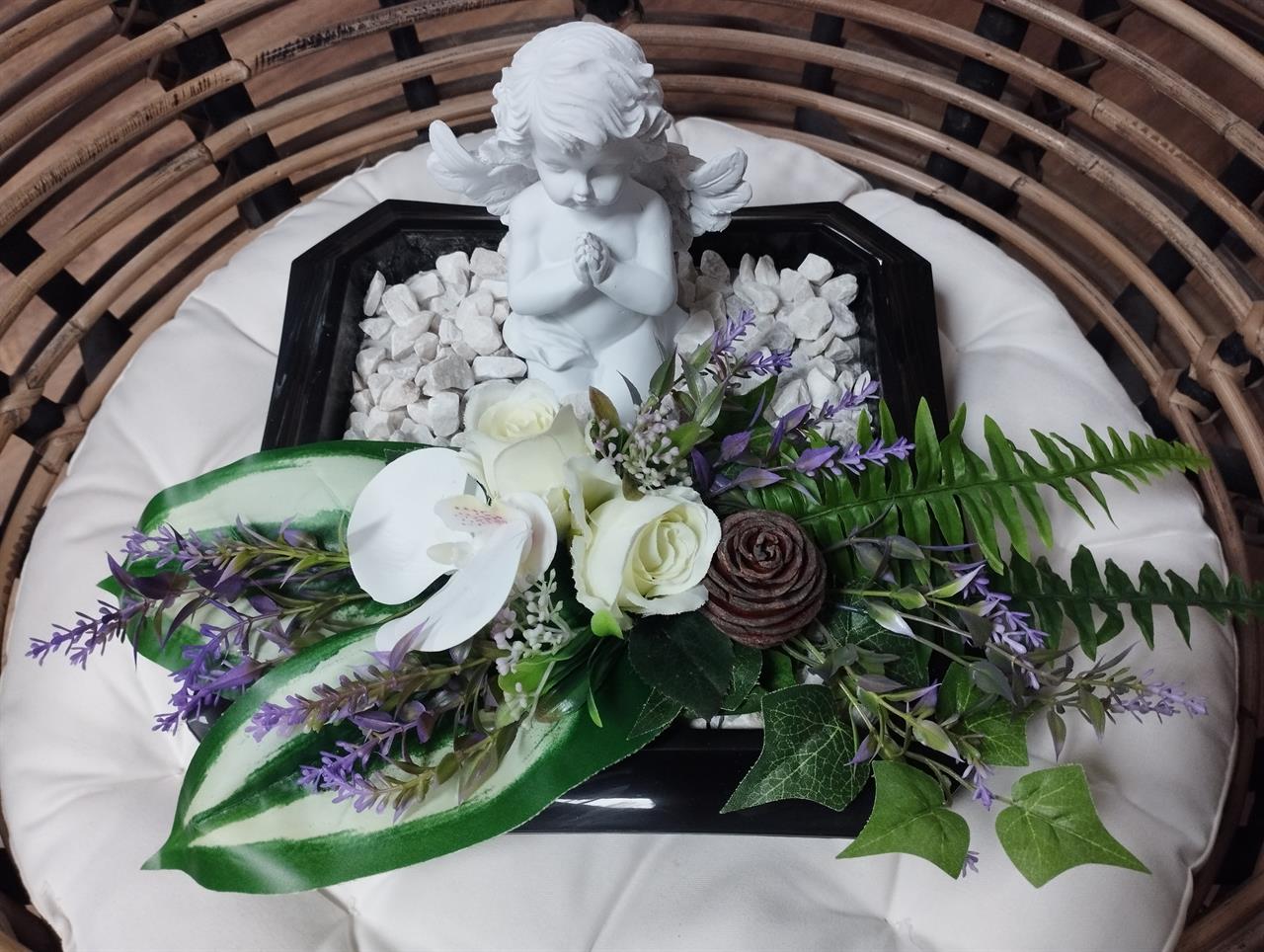 Composition florale aux nuances blanches et violettes sur petits cailloux blancs avec une statuette d'ange. Pot carré noir, côté 28 cm, hauteur 18cm
