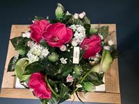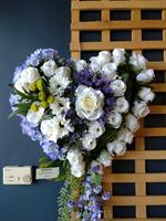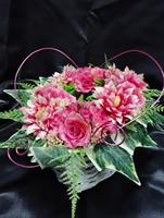 Composition florale de couleur rose sur socle en forme de cœur en osier blanc. 30cm de diamètre et 15cm de hauteur