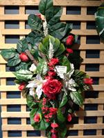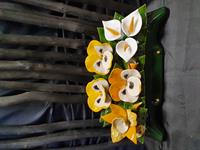 Céramique printanière composées de 3 pensées, 1 narcisse et 1 arum - Emplacement pour 1 inter (au choix) - sur hauteur 20 cm et largeur 36 cm