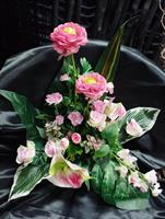 Grande coupe avec fleurs roses : pivoines, œillets, roses, aromes. hauteur : 50 cm largeur : 60 cm