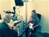 Papa, examinant les yeux de sa petite-fille, Nathou, intriguée sur les genoux de sa maman. Catherine, la maman de Nathou